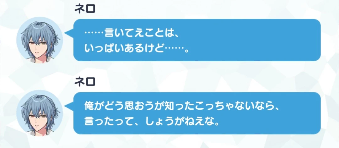 「しょうがねえな」に近所の兄ちゃんみがある。血縁のある兄ちゃんならもうちょい責任感あると思う。肩の力抜けてるところ、ネロの好きなところです。